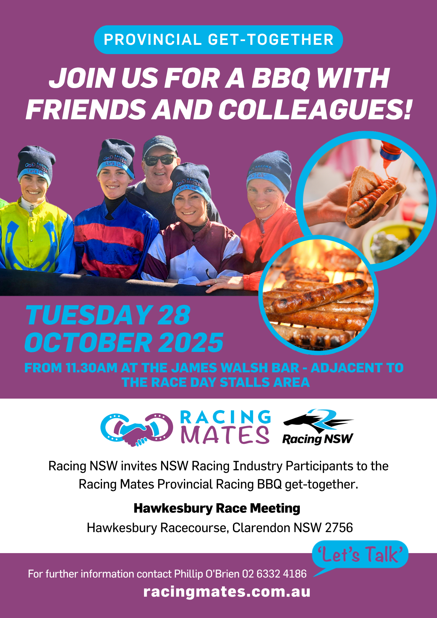 The Racing Mates BBQ will be held for participants from 11.30am at the James Walsh Bar of Hawkesbury Race Club, prior to raceday.