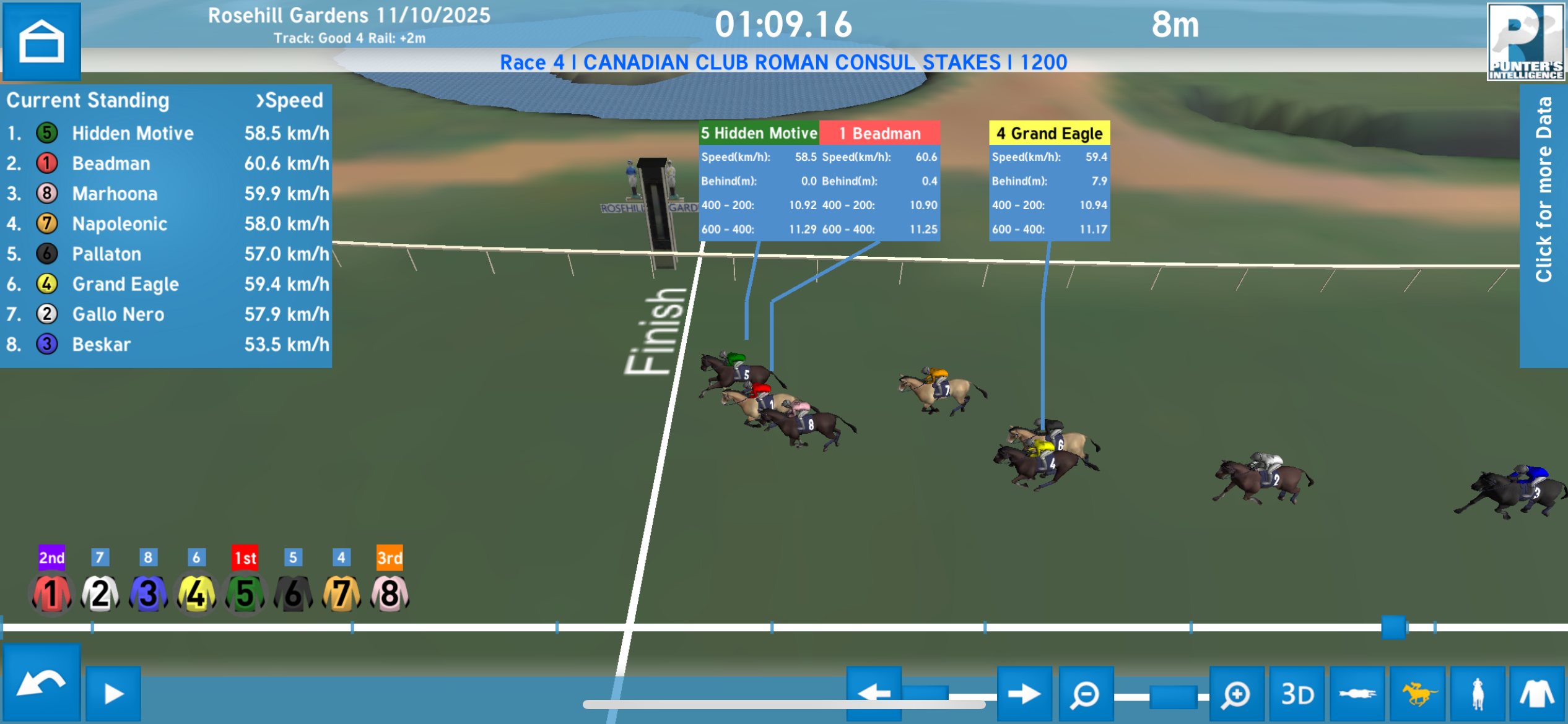 Second fastest in the Roman Consul was fifth placed Grand Eagle, and he did a lot of his work in the middle stages running the fastest 800m-400m in 22.50 and kept going to record a last 600m of 33.49.
