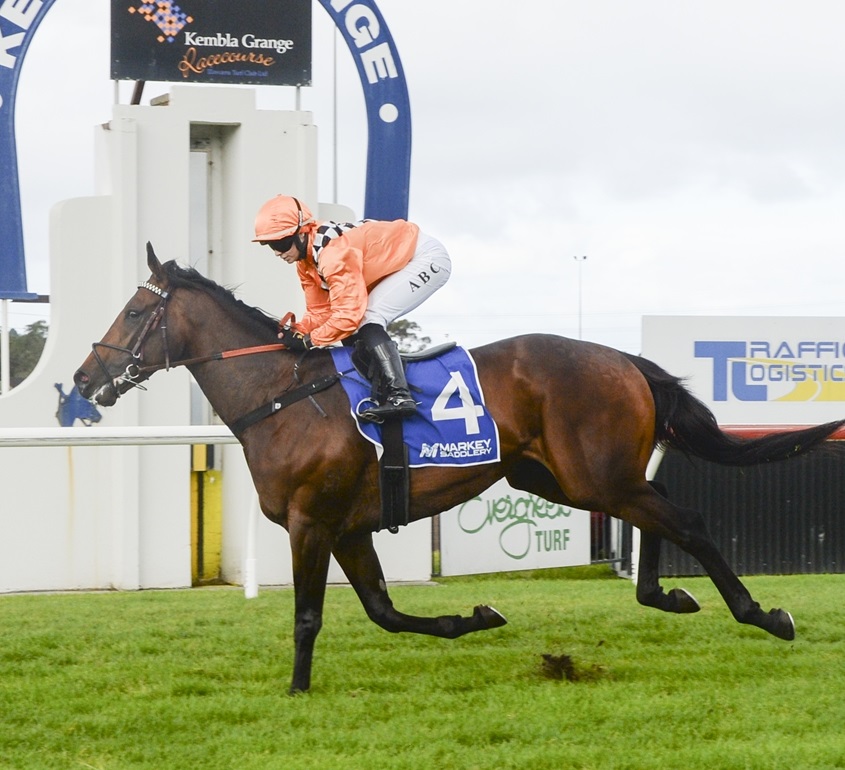 Tenbury Wells (Alysha Collett) scores at Kembla Grange. Image by Bradley Photographers